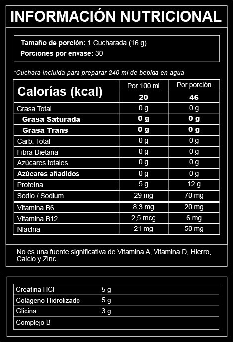 • Contenido: 16g por scoop, 5g de creatina, 5g de colágeno, 3g de glicina y complejo B
