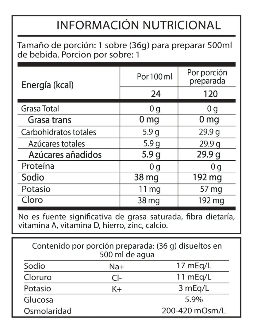 • Contenido: 36g por 1/2 scoop, 180mg de Sodio, 218g de Cloro, 60mg de Potasio y 60g de glucosa.