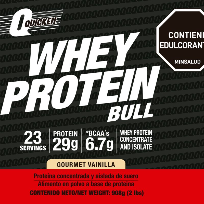 Proteína Whey Quicken Bull: 100% suero de leche concentrado. Rápida digestión, alto valor biológico. Ideal en recuperación poscarrera y mejora de masa magra. Envase de 11 servicios.